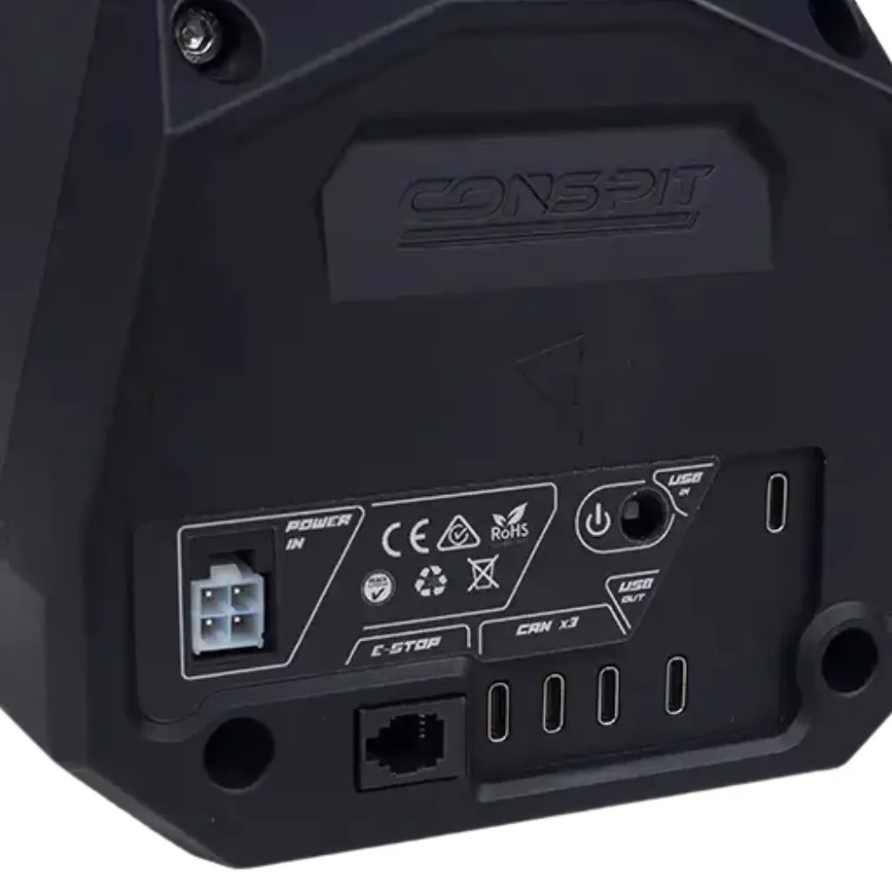La base est compacte et légère (environ 5,9 kg), ce qui permet de l'installer facilement sur un cockpit ou même un bureau. Elle est compatible avec le système de fixation rapide CONSPIT CDR pour un montage ou un changement de volant rapide, rigide et sans jeu.