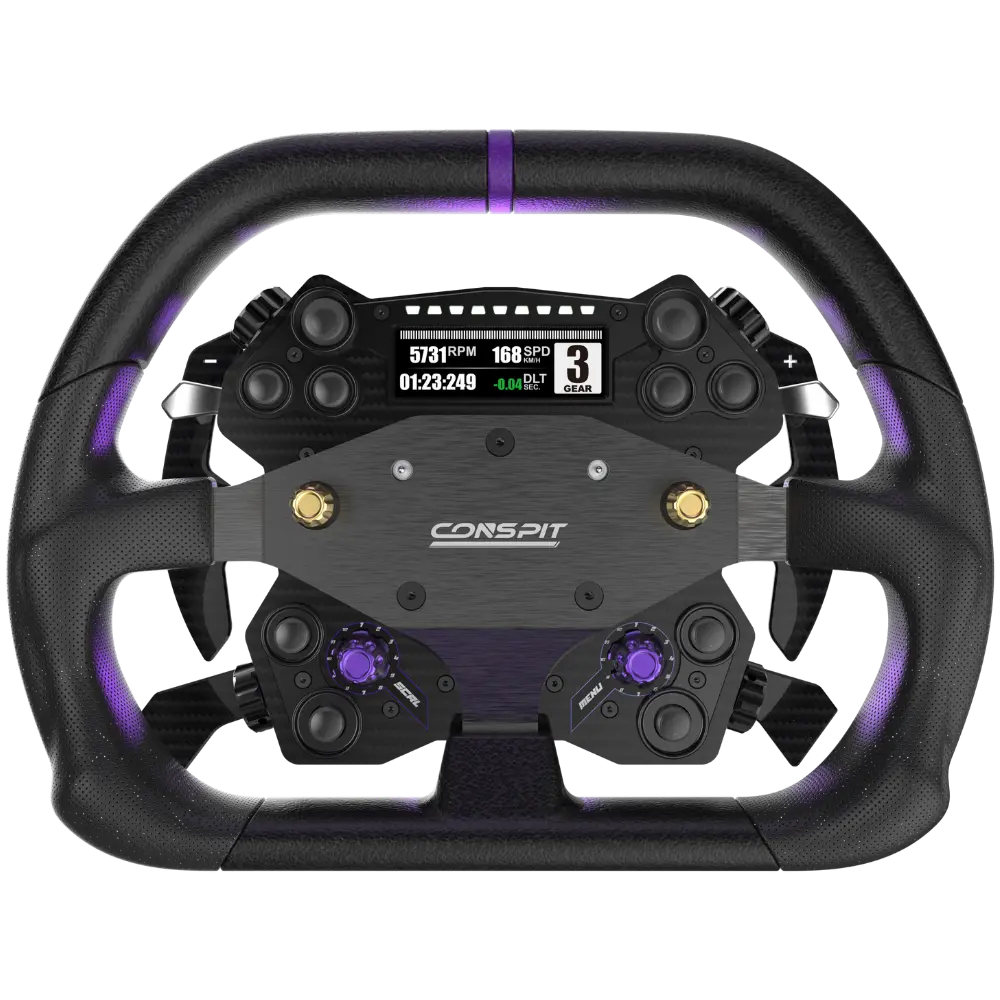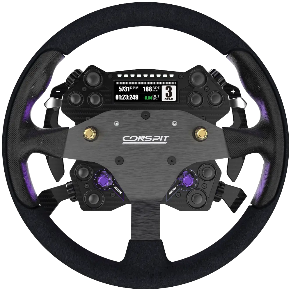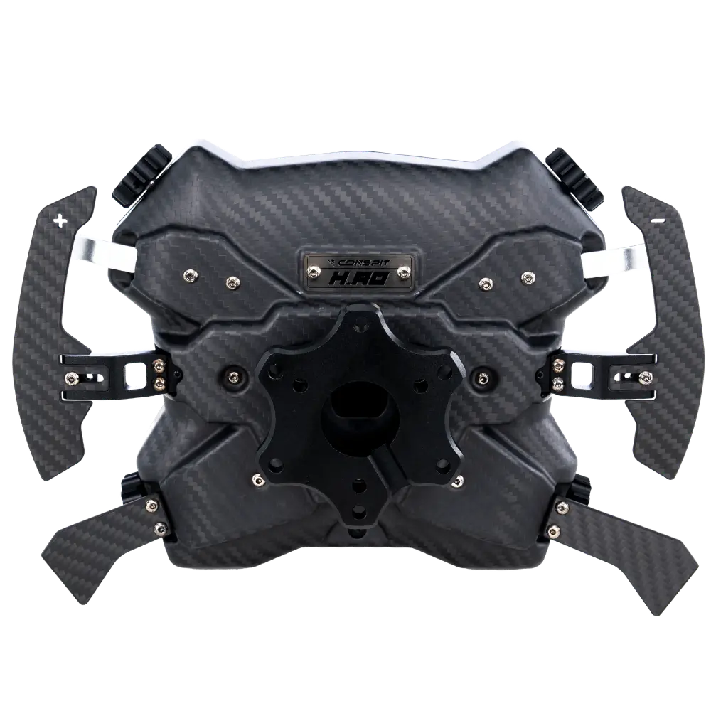 Le moyeu CONSPIT H.AO est un moyeu de volant entièrement en fibre de carbone conçu comme le centre de contrôle de votre cockpit de sim racing. Il remplace le volant traditionnel à usage unique par un système modulaire — un seul moyeu qui fonctionne pour les disciplines GT, rallye, drift et formule, permettant de changer la jante en quelques secondes lorsque votre session l'exige.