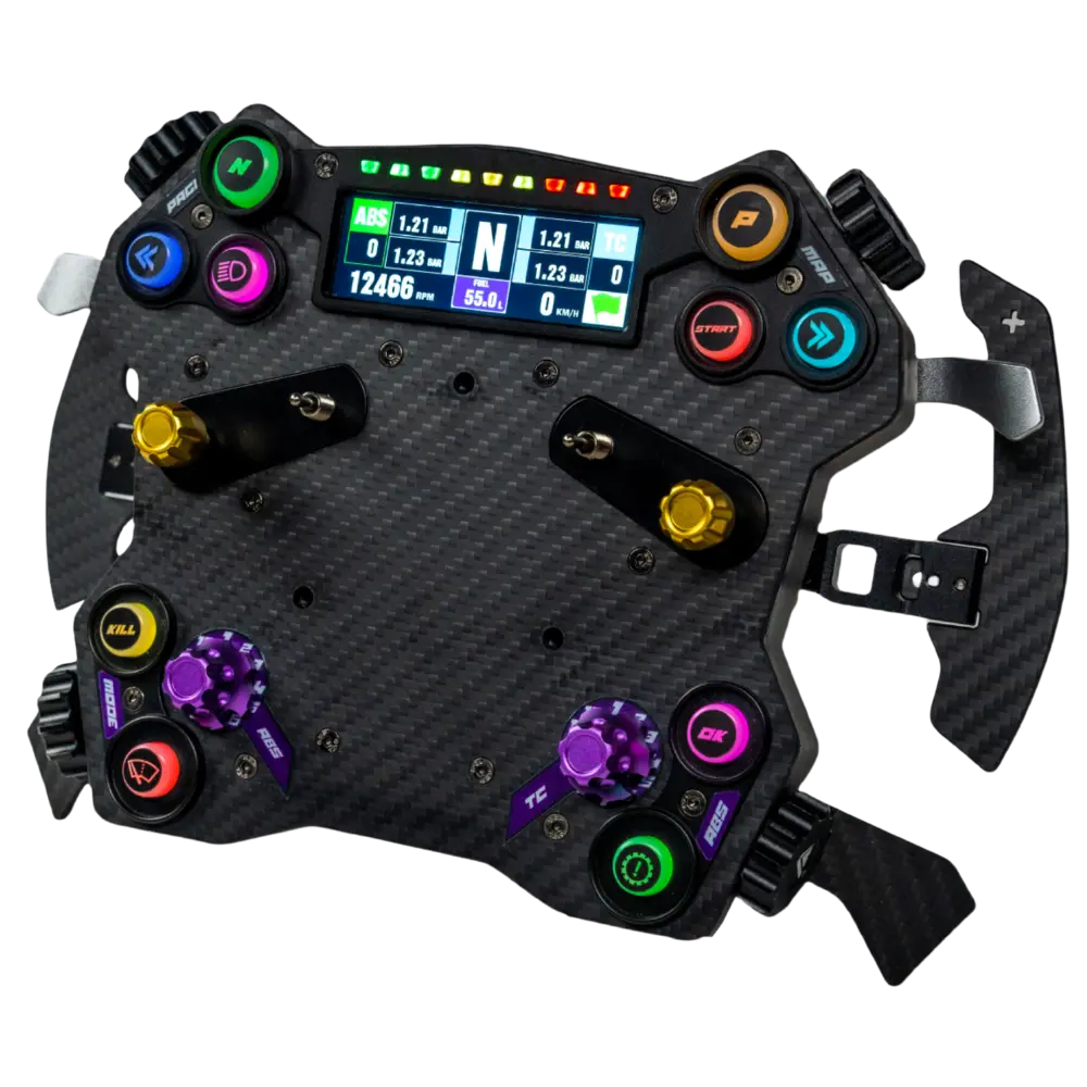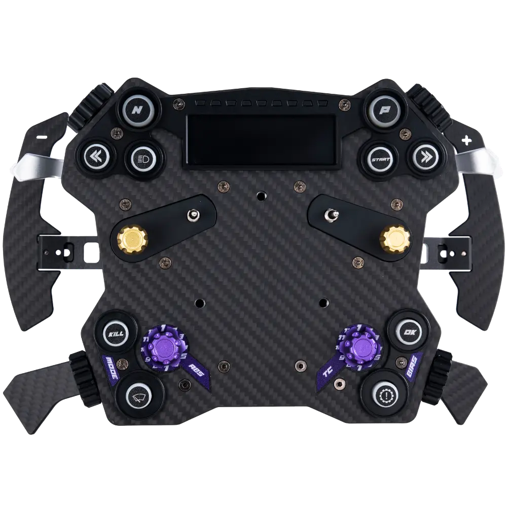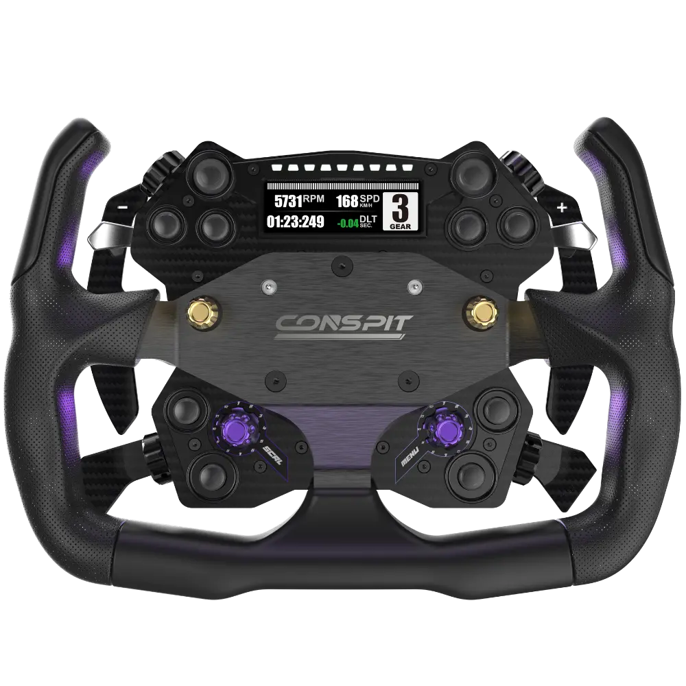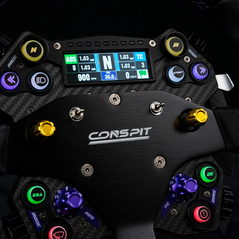 Le moyeu CONSPIT H.AO est un moyeu de volant entièrement en fibre de carbone conçu comme le centre de contrôle de votre cockpit de sim racing. Il remplace le volant traditionnel à usage unique par un système modulaire — un seul moyeu qui fonctionne pour les disciplines GT, rallye, drift et formule, permettant de changer la jante en quelques secondes lorsque votre session l'exige.