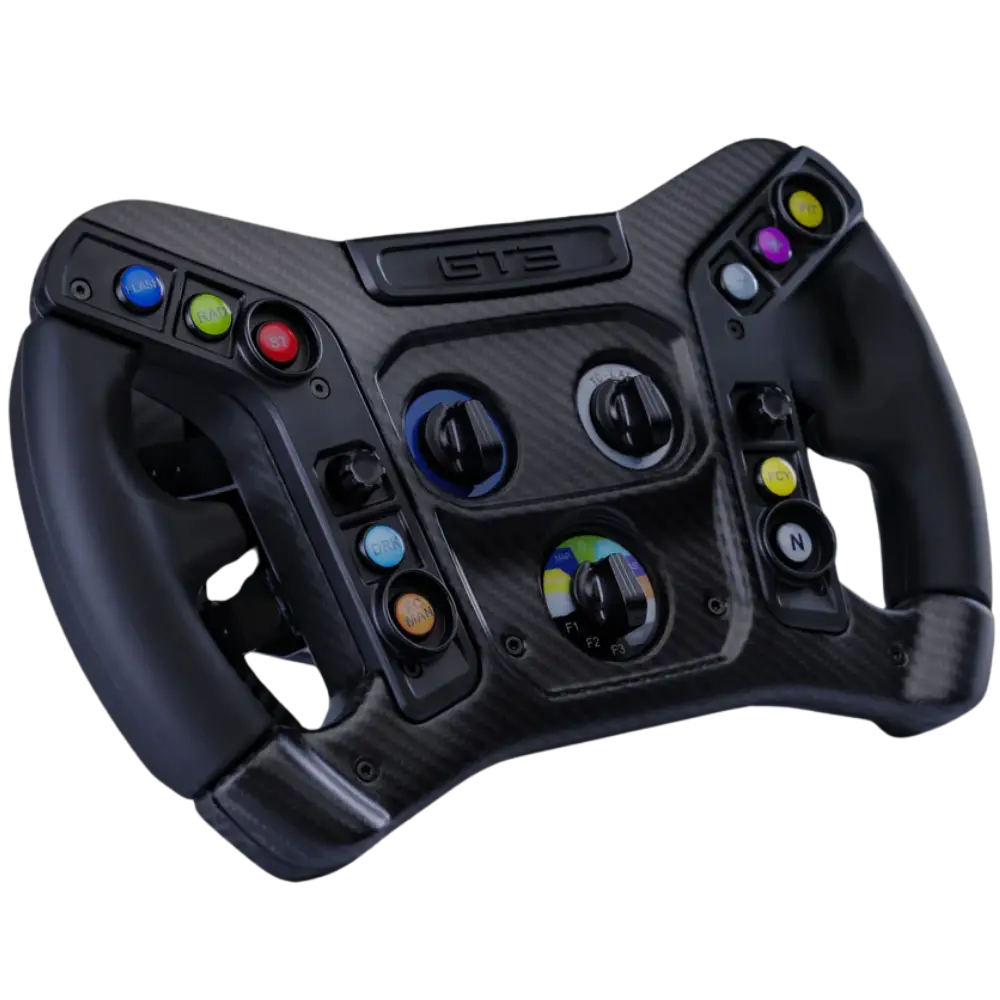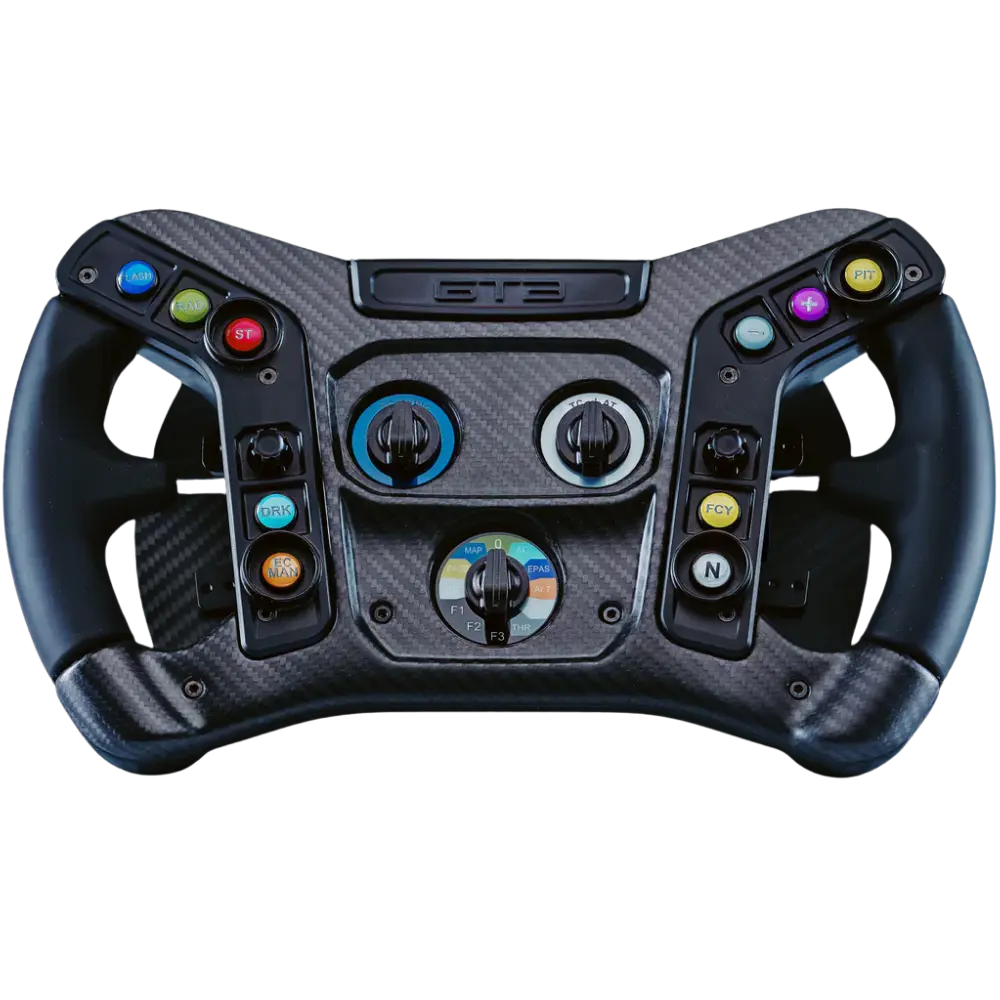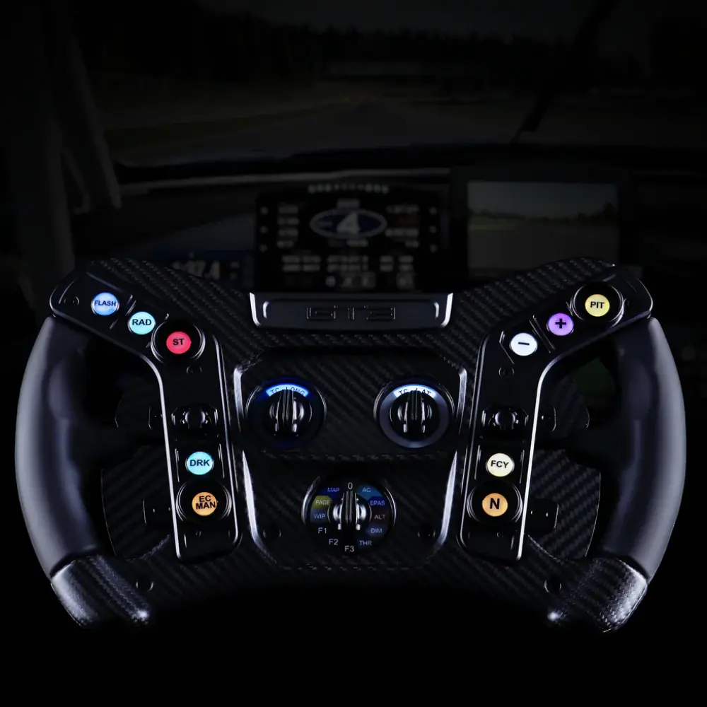 The control layout was designed in collaboration with Ford and the GT racing teams for use in endurance competition, so every button, rotary, and switch is positioned where a racing driver’s hands naturally reach. The open-top design maximises screen visibility in a rig environment, and the ergonomic grip geometry is optimised for long-stint comfort without sacrificing control during high-load corners.