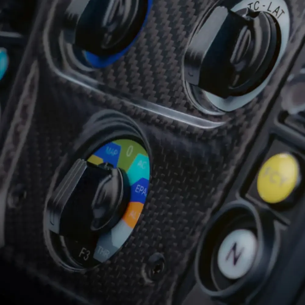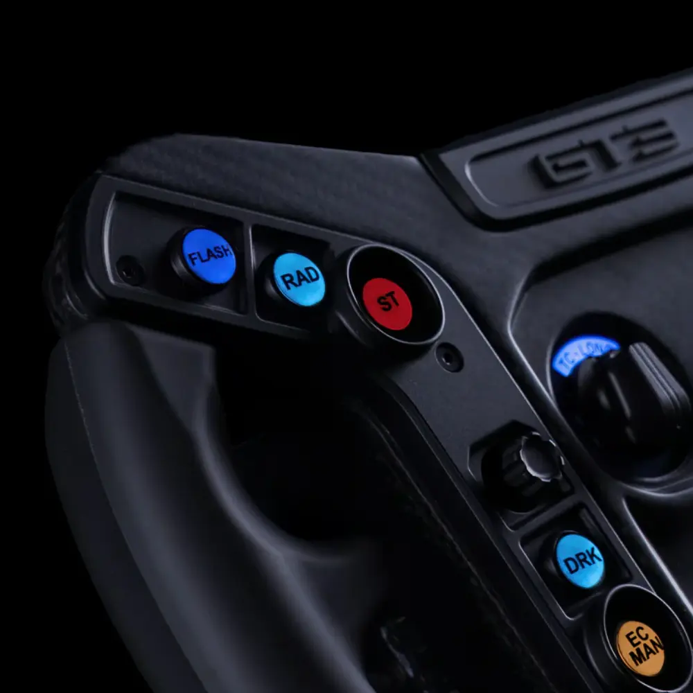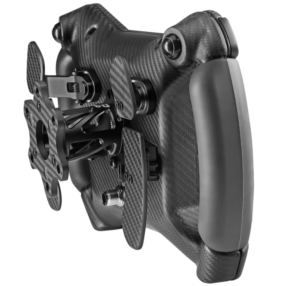 Button quality is automotive grade throughout. The 10 APEM push-buttons each require 650 grams of actuation force, making them firm, deliberate, and consistent. The 2 Otto P9 rear buttons handle secondary inputs, and the 2+2 ALPS 7-way funky switches and 3 Elma 12-position rotary switches provide the density of control that endurance and multi-class racing demands. The magnetic paddle shifters deliver fast, tactile shifts, and the Hall sensor analog clutch gives you genuine bite-point control for race starts and heel-toe work.