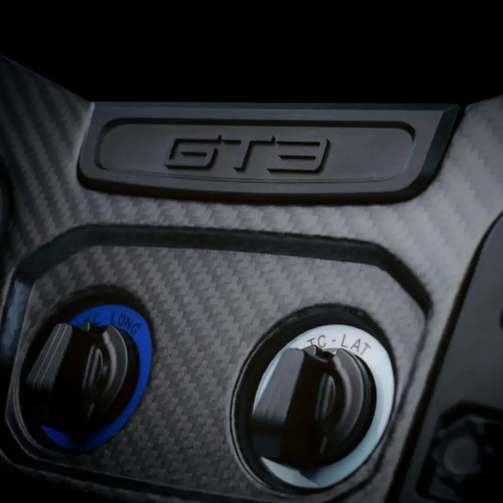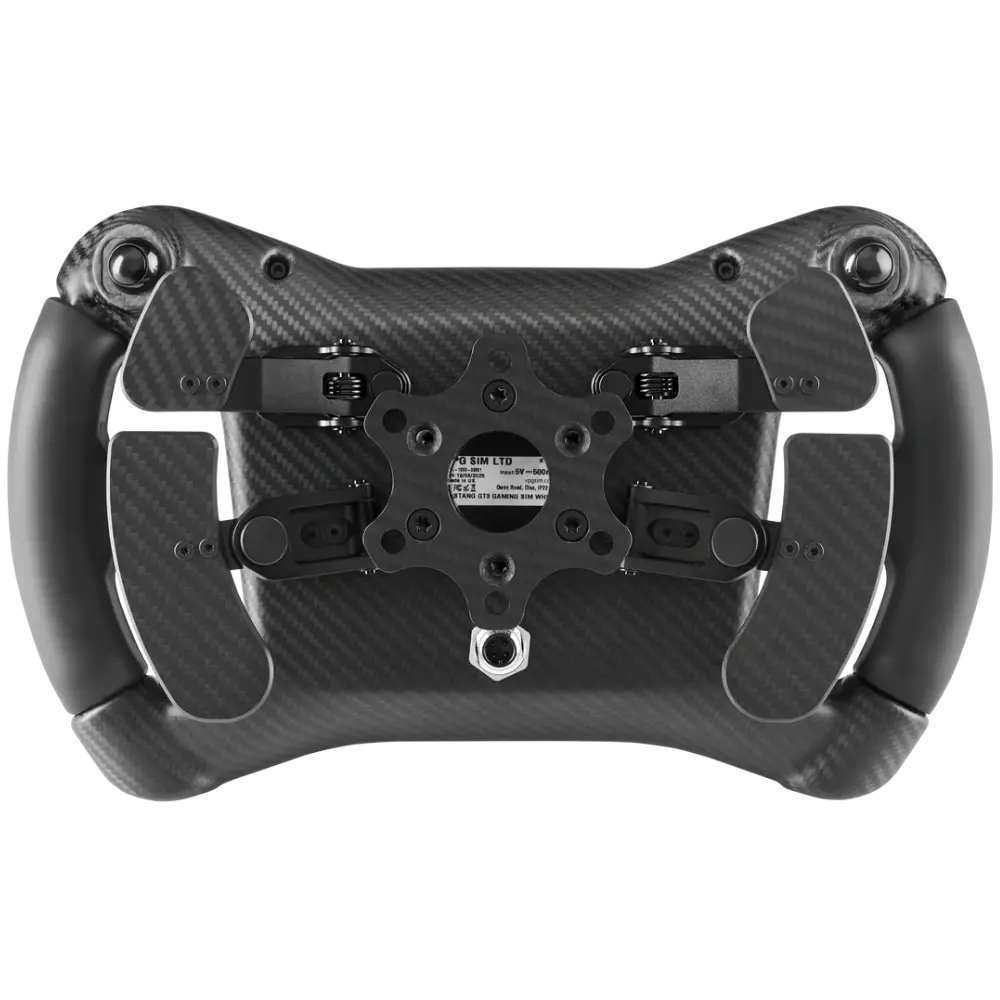 The carbon fibre body and grip sections are genuine race-grade carbon, the same material and layup used on the actual GT3 car. This gives the wheel its characteristic stiffness, its exact weight distribution, and the tactile quality underhand that only real carbon delivers. At 1,120 grams, the weight is precisely that of a competition steering wheel, which means the rotational inertia your direct drive base works against is the same as a real race car driver experiences, directly affecting how force feedback translates from the base through the wheel and into your hands.